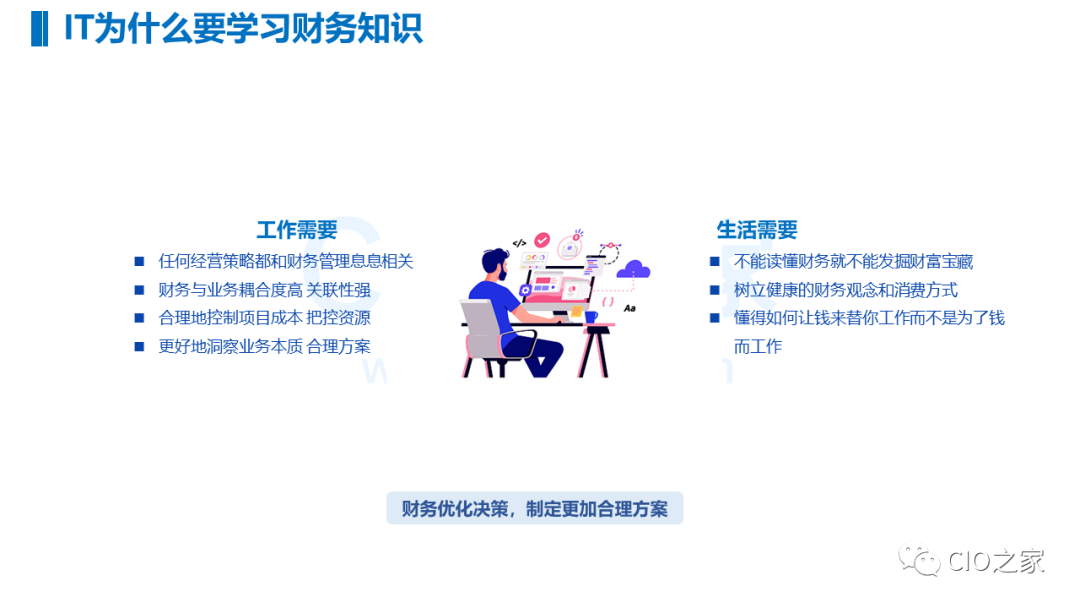 大部分IT人可能都不是财务出身,但很多业务与财务有着千丝万缕的关系,自学习财务基础知识是很必要的,不论你是在工作还是在生活,财务都会影响你的。只有了解财务会计基本知识、看得懂财务报表,以及学会怎样去分析财务报表,你才能更清楚你的工作,明白IT系统在企业营运中扮演什么样的角色,从而以更高、更广的角度去看待、分析和处理问题,展现出不同的洞察力及业务敏锐度