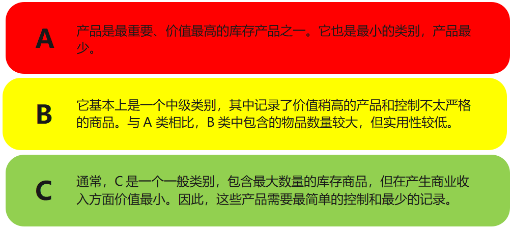 步骤3:汇总并添加年度销售总量和年度消费总值。 步骤4:累计销售产品的百分比以及年消费值的百分比。 步骤5:在最后一步中,将数据和数字分为A、B、C 三个类别。请记住,必须按 80:15:5 的比例设置数据。 该表显示,A类中列出的物料产生了约79%的年消费值,B类产生了 13%,而C类产生了8%的收入。 六、ABC分析的显著特点 有必要在单独的注释中强调所有三个类别(即 A、B 和 C)的关键特征。看看下面的图片。 七、为什么使用ABC分析进行库存管理至关重要? 许多组织拥有大量库存单位或SKU,但这并没有帮助他们蓬勃发展和扩大业务。此外,企业家还必须应对各种其他库存管理挑战。 它可能包括对库存的了解不足、管理流程效率低下、在管理人员和空间方面发现问题等等。 库存分类是一种可行的解决方案,可以帮助企业简化库存管理流程。顾名思义,库存分类是一种根据各种产品的需求价值来战略性地设定其价格的方法。 库存的ABC方法是一种分类技术,可以帮助库存管理者解决与维护库存相关的所有问题并最大化货物的库存价值。 1、分析客户对特定产品类别的需求 每个产品必须经过四个主要阶段;启动、成长、成熟、然后衰退。当产品获得最佳价值时,它不可避免地会在某个时间点下降。它被称为产品的寿命。 值得注意的是,产品的寿命取决于客户的需求。正是在这里,ABC库存分类因其帮助企业精准分析客户需求而受到关注。 企业主和仓库经理可以分析特定产品的消费者需求并相应地管理库存。如果某种商品的市场升级,下跌期就会进一步推后。 2、简化和优化库存流程 其中意义重大的之一,ABC分析的独特卖点正在简化和优化库存管理流程。它可以帮助仓库经理根据年度消耗值和收入来组织和分类库存。 产品也可以根据客户需求进行分类。 3、与供应商进行有利的谈判 ABC分析对于与供应商进行有利的谈判也很有用。例如,如果一个企业正在与A类产品的供应商进行谈判,那么它必须在那里进行最大的投资,因为它提供了最大的收入。 即使企业提出了利润丰厚的报价,供应商仍然有可能不愿意达成交易。 在这种情况下,企业仍然可以通过提供其他好处(例如降低首付和提供免费送货)来达成交易。有利于为双方创造良好的双赢局面。 它还可以让企业在A类产品上节省更多,并获得更多利润。 4、产品的战略定价 ABC库存分析还允许组织战略性地设定各种产品的价格。它提高了产品的库存价值。一旦战略性地设定了产品的成本,根据不同的类别调整它们就相对容易了。 如果产品的需求增加,卖家可以提高价格。 5、提高客户服务水平 仓库经理可以根据产品的价值和重要性来库存产品。 这意味着他们不需要积压任何此类不定期销售且利润率较低的商品。在这里,ABC分析可以发挥关键作用,帮助仓库经理根据物品分类设置服务级别。它进一步简化了供应链管理流程。 6、资源的分配 仓库经理必须给予 A 类物品特殊的地位,并专注于该特定类别。但如果他发现 A 类商品的需求减少,并且不再产生更高的收入,那么该产品就会被降级到较低的类别。 八、如何进行ABC分析?