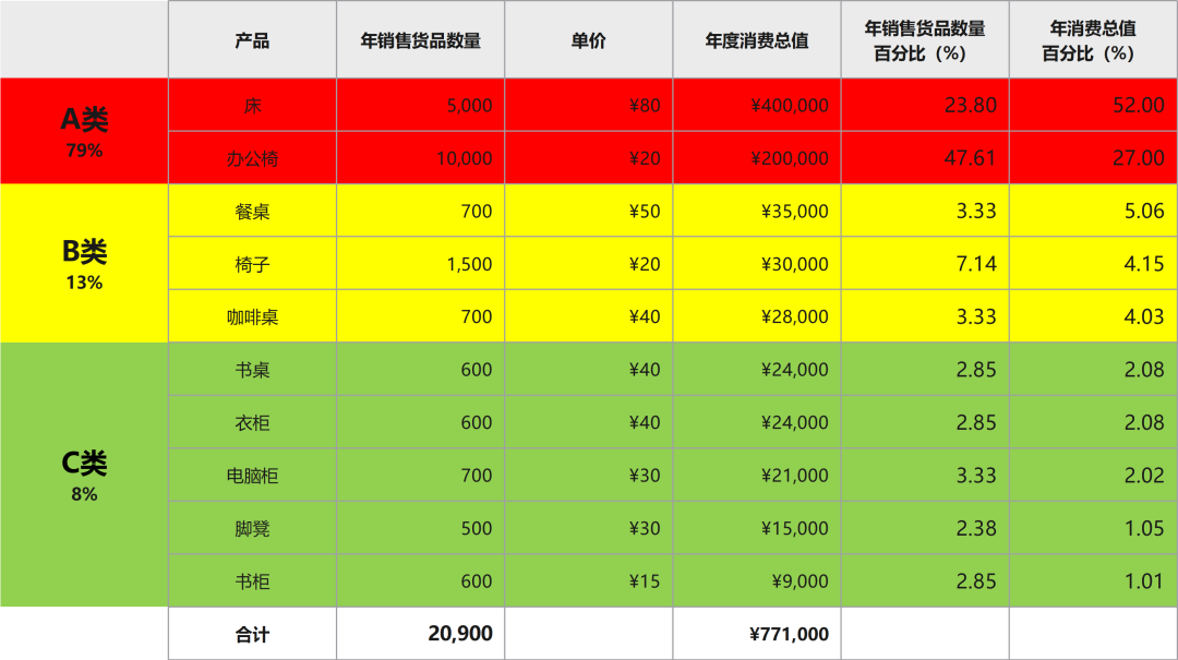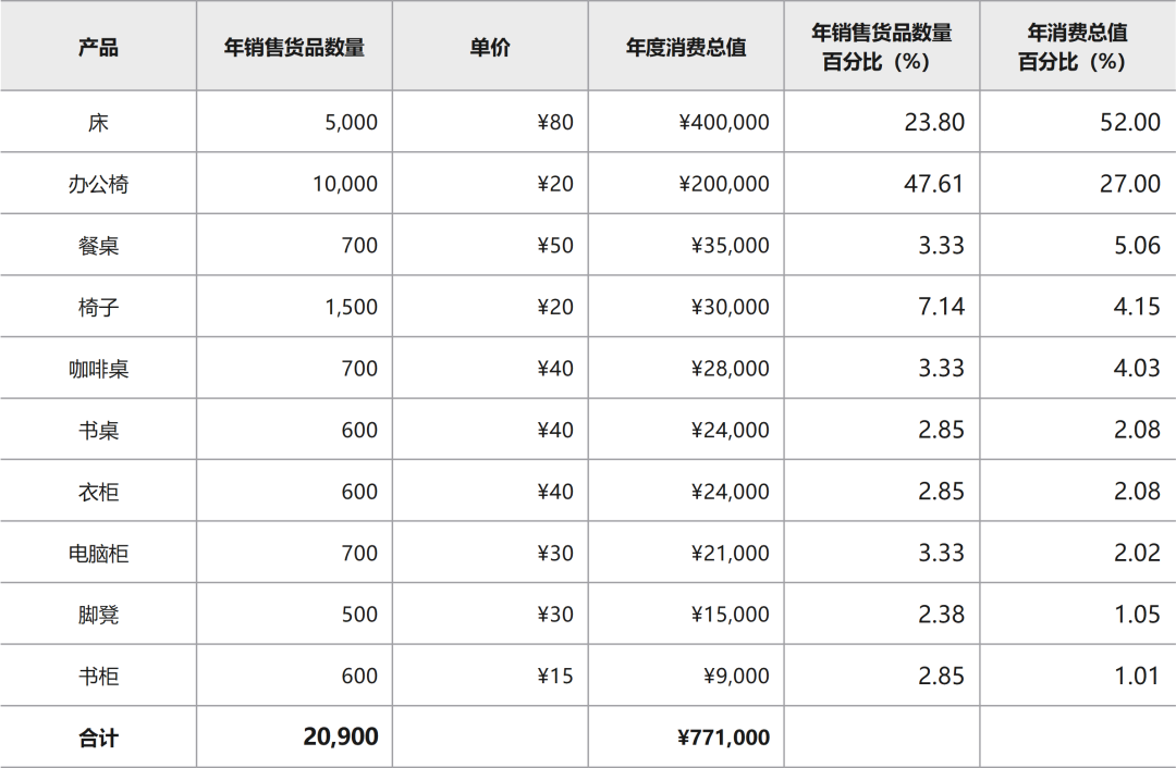 ABC分析也称为ABC分类,是物料管理的一个组成部分。它是一种库存分类方法,根据收入产生库存。 大多数商业组织将库存管理视为最艰巨的任务之一。但库存管理对于制造、零售、电子商务、物流等所有业务领域都至关重要。 它可以帮助企业家保持最佳库存水平并避免缺货情况。 ABC分析是帮助管理者优化库存水平的最佳技术之一。本文将详细讨论它的定义、类别、计算方法和好处。 一、什么是ABC分析? ABC分析也称为ABC分类,是物料管理的一个组成部分。它是一种库存分类方法,根据收入产生将库存主要分为三个不同的类别。 ABC库存帮助企业家和库存所有者识别库存中的重要产品,并根据价值确定管理的优先顺序。库存分析基于帕累托原理。 帕累托原理是一种流行的经济理论,由意大利著名经济学家维尔弗雷多·帕累托发现。帕累托认为,最佳的经济增长只发生在经济的一小部分。这意味着输入和输出之间的关系始终是不平等的。 帕累托原则指出,80%的销量来自前20%的商品。它说,在任何群体中,都有重要的少数和微不足道的许多。它也称为80/20规则。 【维基百科】的定义:ABC分析法又称帕累托分析法或巴雷托分析法、柏拉图分析、主次因分析法 、ABC分类法、分类管理法、重点管理法、ABC管理法、abc管理、巴雷特分析法,是一种根据帕累托最优原则设计的分类方法,是确定库存等级的技术,常用于物资管理中,也称为选择性库存控制。 二、ABC分析的类别 ABC分析基于所有库存货物不可能具有相似或相同价值的理论。因此,这三个类别包括: 如果将帕累托原理应用到 ABC分析中,那么 A 包含了总产品的 20%,几乎产生了 80% 的收入。因此,它需要强大且一致的控制。 B 监管大约 30% 的商品,占 15% 的收入,而 C 拥有最大份额,控制着近 50% 的库存,但只提供总收入的 5%。因此,仓库经理在计算此类库存时相当宽松。 三、ABC分析图 两个金字塔代表 ABC分析图。 第一个金字塔表明库存物料总数的百分比。这里,A 类仅包含10%的产品,B类包含20%的产品,C类的数量最多,占产品的70%。 类似地,如果人们认为第二个金字塔代表平均库存价值的百分比,那么结构就会逆转。 在这里,A凭借近70%的库存价值和创收而成为众人瞩目的焦点,而B则保持其中等水平,控制着20%的库存价值。C只产生10%的收入;因此它的控制能力有限。 在这里,A以近70%的库存价值和创收获得关注,而B保留了其中级现货,控制着20%的库存价值。C仅产生10% 的收入;因此,它的控制有限。 简而言之,A表示最重要,B表示中等必要,C表示最不重要的库存商品。 四、如何计算ABC分析? 仓库经理可以对单个产品组或各种库存执行ABC计算。ABC计算通常分以下五个步骤进行: 首先,将每年的产品数量乘以每件产品的成本并找出该产品的效用。 根据产品的使用价值,将每个产品按降序排列。 添加产品的使用价值,包括物料总数。 找出累计销售商品百分比和年度消费值。 现在,最后将您的数据按大约80:15:5 的比例分为三类。 五、ABC分析示例 通过包含几个表格的示例进一步说明ABC计算。 可以以家具店为例。 步骤1:将物品总数乘以物品单价,得出年度消费总值。 步骤2:记下库存的所有产品后,就可以根据年度消费总值降序列出它们。
