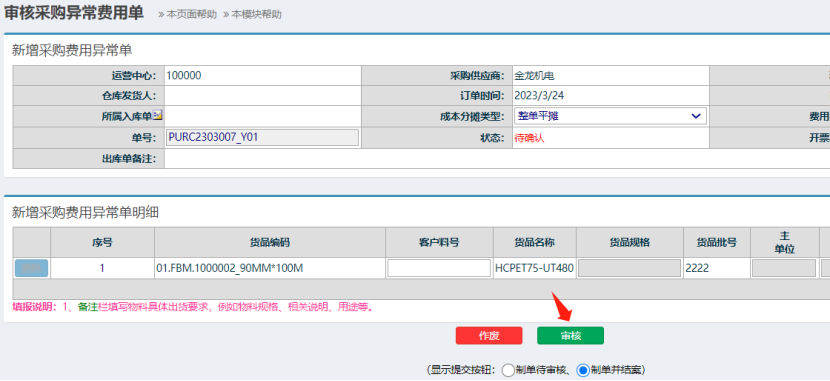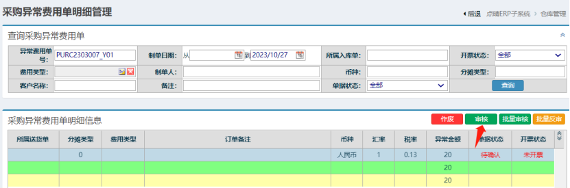 点晴模切ERP-如何审核或作废新增的采购异常费用单