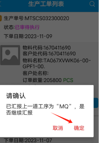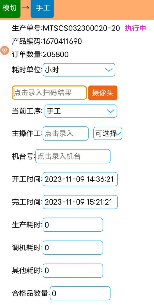 ![]() ![]() 1. 在APP上点开生产工序进度产量汇报 ![]() 2. 点击进度产量汇报进入 如下图: ![]() 点击确定后,进入汇报页面 ![]() 4. 然后扫码录入机台,操作工,填上调机时间,生产用时,汇报数量,合格数量 如下图: