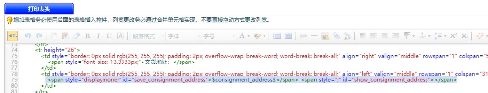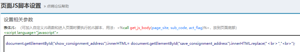 在表体加上以下代码: document.getElementById("show_consignment_address").innerHTML= document.getElementById("save_consignment_address").innerHTML.replace(/<br>/g,"<br>"); 如下图: