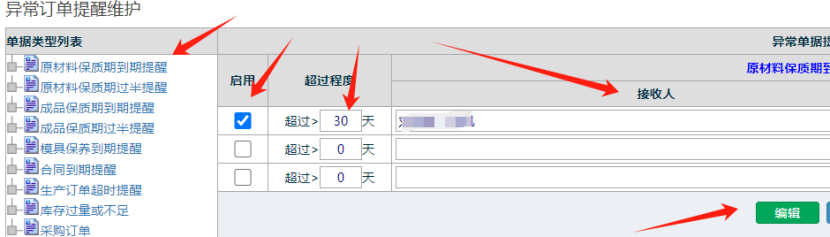 点击原材料保质期,然后勾上启用,设置天数,接收人,最后点击编辑 如下图: 点晴模切ERP更多信息:http://moqie.clicksun.cn,联系电话:4001861886 该文章在 2023/11/28 9:20:10 编辑过 |