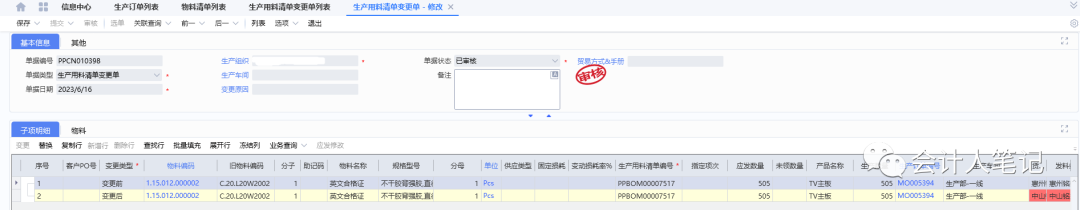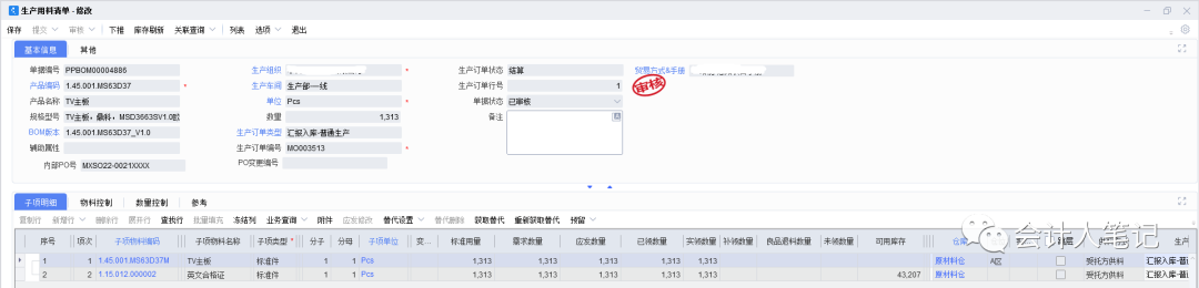 以1.45.001.MS63D37主板的制造为例:假设此款主板的BOM是“1.45.001.MS63D37M主板+1.15.012.000002英文合格证1PCS”。如果我们要生产1313片不带M的主板,那么根据BOM,我们需要1313片带M的主板和1313片英文合格证。这是BOM的静态需求。然而,在实际生产过程中,可能会出现一些变动。比如,这个英文合格证实际上是ML投料,HM是没有库存的,PMC投料错误,就要做生产用料清单变更单。