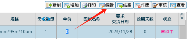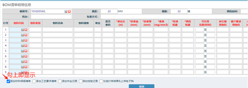![]() ![]() 点击进入 如下图: ![]() 找到销售下的样品单,然后点中再点击编辑。 如下图: ![]() 勾上要显示的,然后选择填写,像正常做BOM一样,把这次样品生产的材料明细编辑。 ![]() 最后编辑提交。 然后在主页面,点击审核,进行排产操作。 ![]() 有两个按钮,可以直接排产,或待排产 如下图: ![]()