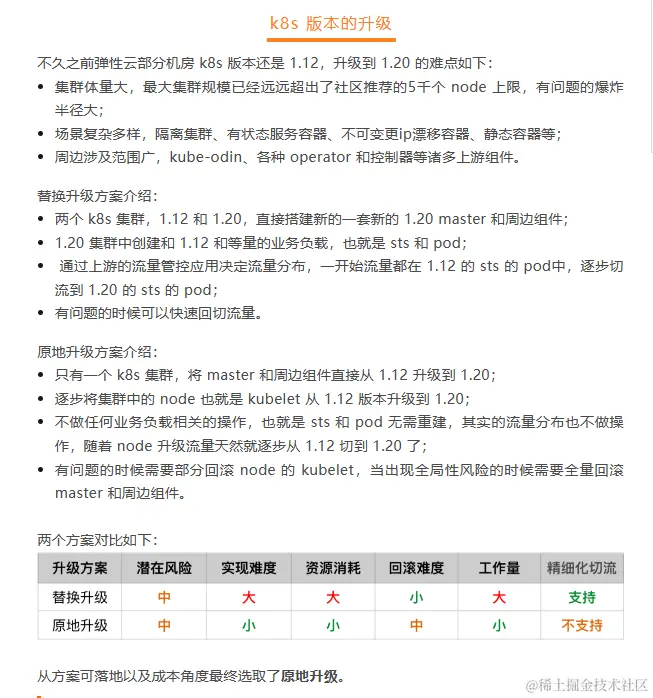 网传是因为升级导致的故障 恰巧DD技术在公众号上曾经发布过一篇# DD弹性云基于 K8S 的调度实践文章,文章里介绍了他们选择的升级方案,以及如此选择升级方案的原因