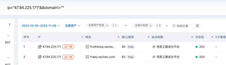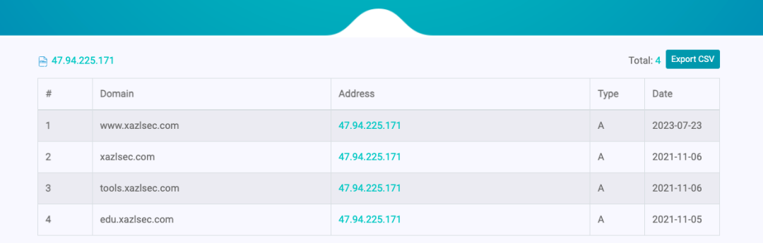 0x04 数据汇总将之前提到的几种方式获取到的主域名和子域名进行整合,先对子域名进行解析比对,是否有包含目标 IP 的域名存在,如果不存在,则需要将所有主域名进行整合,结合自定义的子域名字典,进行 DNS 枚举,从而发现该 IP 的真实域名。 0x05 总结基于以上技术,我已经实现了一键查询脚本,在查询到数据之后会进行入库,下次再次查询将不再重新获取,也可以通过域名枚举的方式扩充本地数据库,从而让 IP 反查域名的效率翻倍,最终成果如图: