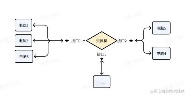 我们可以设想:如果我们有这样一台设备,它有多个端口,每个端口连一台或多台电脑,端口之间是隔离的。同一个端口上的电脑发消息依然是共享,但如果想要发消息给另一个端口上的电脑,就需要通过这台设备将消息转发到对应的端口。这个设备叫做”交换机“。