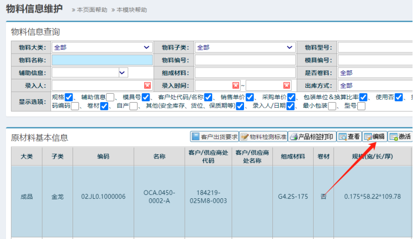 然后点中某个物料,然后点击编辑按钮 如下图: