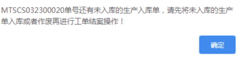 点晴模切ERP-弹出提示:还有未入库的生产入库单,请先将未入库的生产单入库或者作废再进行工单结案操作!