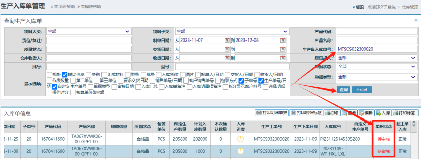 操作步骤: 点击进入 如下图: ![]() 输入工单号查询后,发现有两笔处于审核状态的生产入库单 如下图: ![]() 所以要这两笔进行入库或作废操作后,才能再结案工单。 操作如下链接查看 点晴ER-生产入库单作废操作:http://16946.oa22.cn 点晴ERP-生产入库审核入库操作流程:http://22063.oa22.cn