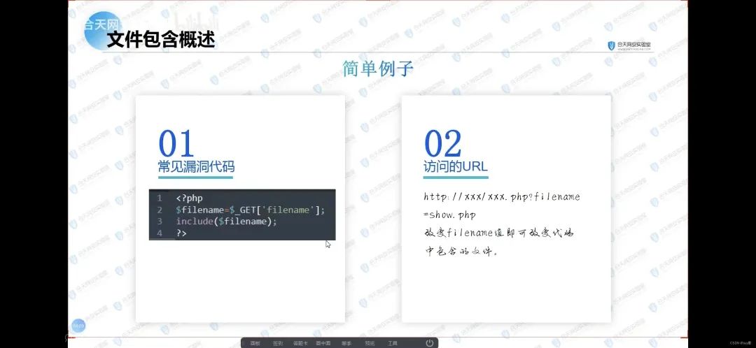 一、文件包含漏洞概述1.什么是文件包含 程序开发人员通常会把可重复使用的函数写到单个文件中,在使用某个函数的时候,直接调用此文件,无需再次编写,这种调用文件的过程通常称为包含。 2.文件包含漏洞产生原理 文件包含函数加载的参数没有经过过滤或严格定义,可以被用户控制,包含其他恶意文件,导致了执行非预期代码。 程序开发人员都希望代码更加灵活,所以通常会把被包含的文件设置为变量来进行动态调用,但正是由于这种灵活性,从而导致客户端可以调用任意文件,造成文件包含漏洞 例子