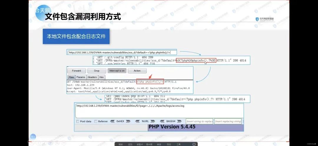 PHP配置中的allow_url_include选项如果打开,PHP会通过Include/Require进行远程文件包 含,由于远程文件的不可信任性及不确定性,在开发中禁止打开此选项,PHP默认是关闭的。 四、常用的利用方式1.本地文件包含配合日志文件 1、日志的默认路径 /etc/httpd/logs/access_log或/var/log/httpd/access_log //apache+linux D:xamppapachelogsaccess.log或D:xamppapachelogserror.log //apache_win2003 C:WINDOWSsystem32Logfiles //iis6.0+win2003 %SystemDrive%inetpublogsLogFiles //iis7.0+win2003 nginx 日志文件在用户安装目录的logs目录下 2、web中间件默认配置uoh文件 /etc/httpd/conf/httpd.conf或index.php?page=/etc/init.d/httpd //apache+linux C:/Windows/system32/inetsrv/metabase.xml //iis6.0+win2003 C:WindowsSystem32inetsrvconfigapplicationHost.config //iis7.0+win 3、利用 访问http://www.xx.com/<?php phpinfo(); ?>时,<?php phpinfo(); ?>也会被记录在日志里,也可以插入到User-Agent;但是在日志里这句话被编码了;所以用Burp Suite修改来绕过编码;然后包含相应的日志文件:http://localhost/include/file.php?file=../../apache/logs/access.log //(这里利用相对路径,找到日志文件,并以php解析的方式打开) 4、防御 隐藏或修改默认日志文件 设置日志文件读取权限 找到Apache路径,利用包含漏洞包含日志文件获取Webshell。 Apache两个日志文件:access.log、error.log 很多时候,web服务器会将请求写入到日志文件中,比如说apache。在用户发起请求时,会将请求写入access.log,当发生错误时将错误写入error.log。