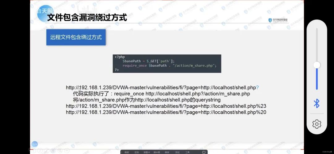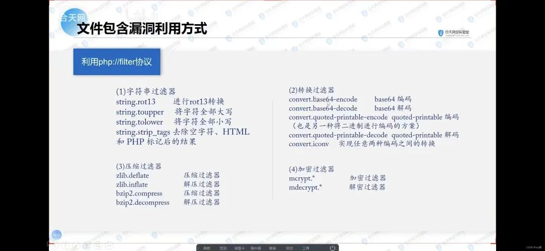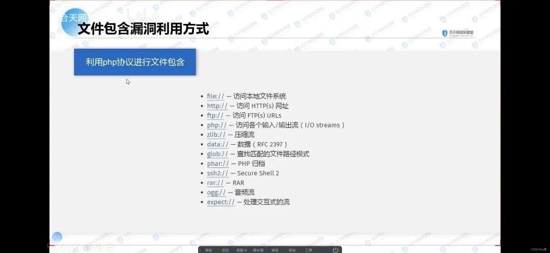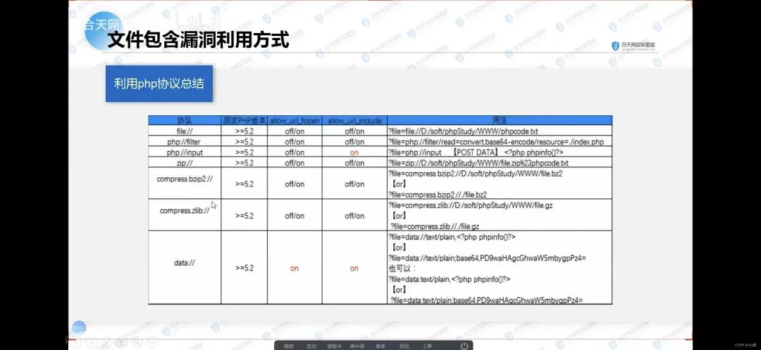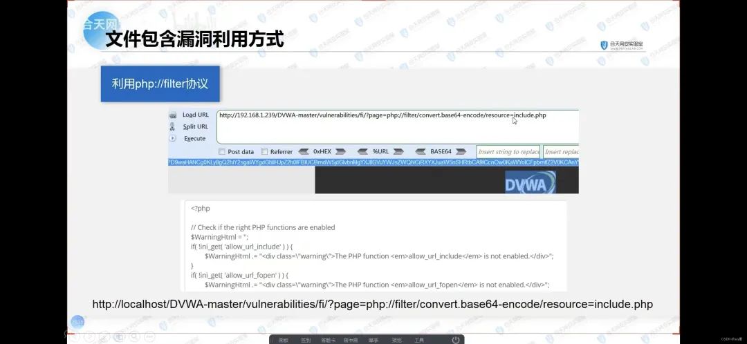php相关配置 allow_url_fopen=On// 本地文件包含(LFI),但这个无论On或Off,本地文件包含都存在allow_url_include=On// 远程文件包含(RFI) 3.存在文件包含的脚本语言及应用函数