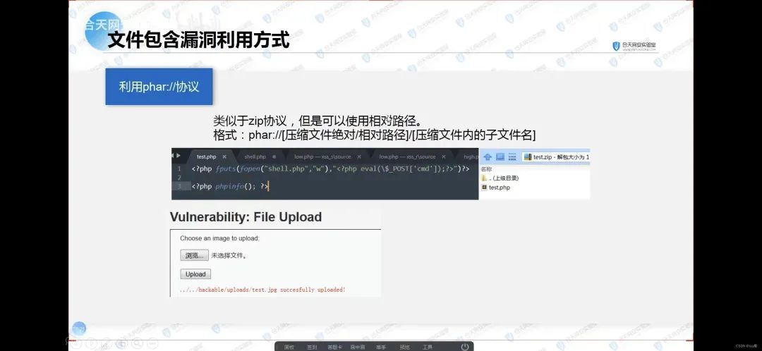 如果网站允许我们上传压缩文件,我们也可以将php文件压缩后进行上传,再通过zip://协议执行。 以DVWA平台为例,我们将phpinfo.php文件进行压缩后上传: