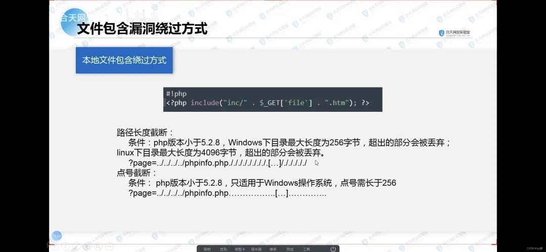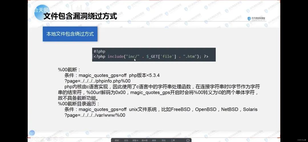 常见的敏感信息路径: Windows系统 c:\boot.ini // 查看系统版本 c:\windows\system32\inetsrv\MetaBase.xml // IIS配置文件 c:\windows\repair\sam // 存储Windows系统初次安装的密码 c:\ProgramFiles\mysql\my.ini // MySQL配置 c:\ProgramFiles\mysql\data\mysql\user.MYD // MySQL root密码 c:\windows\php.ini // php 配置信息 Linux/Unix系统 /etc/passwd // 账户信息 /etc/shadow // 账户密码文件 /usr/local/app/apache2/conf/httpd.conf // Apache2默认配置文件 /usr/local/app/apache2/conf/extra/httpd-vhost.conf // 虚拟网站配置 /usr/local/app/php5/lib/php.ini // PHP相关配置 /etc/httpd/conf/httpd.conf // Apache配置文件 /etc/my.conf // mysql 配置文件 二、文件包含漏洞类型1.本地文件包含漏洞(LFI) 能够读取或执行包含本地文件的漏洞,称为本地文件包含漏洞。 包含服务器本身存在的恶意文件 a.txt <?php phpinfo(); ?> b.php <?php $b=$_GET['id']; include($b); ?> payload localhost/b.php?id=a.txt //返回phpinfo页面 注: