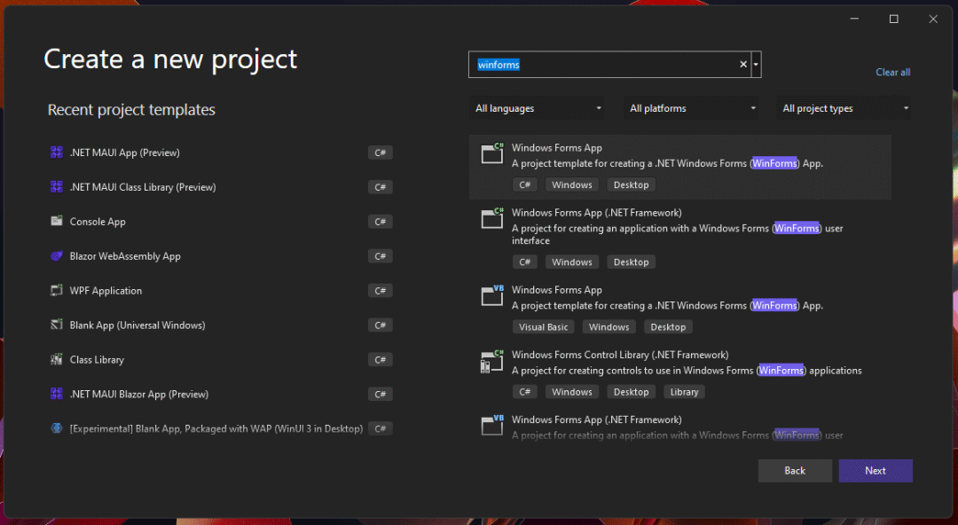 打开Visual studio创建项目,项目选择Windows from。