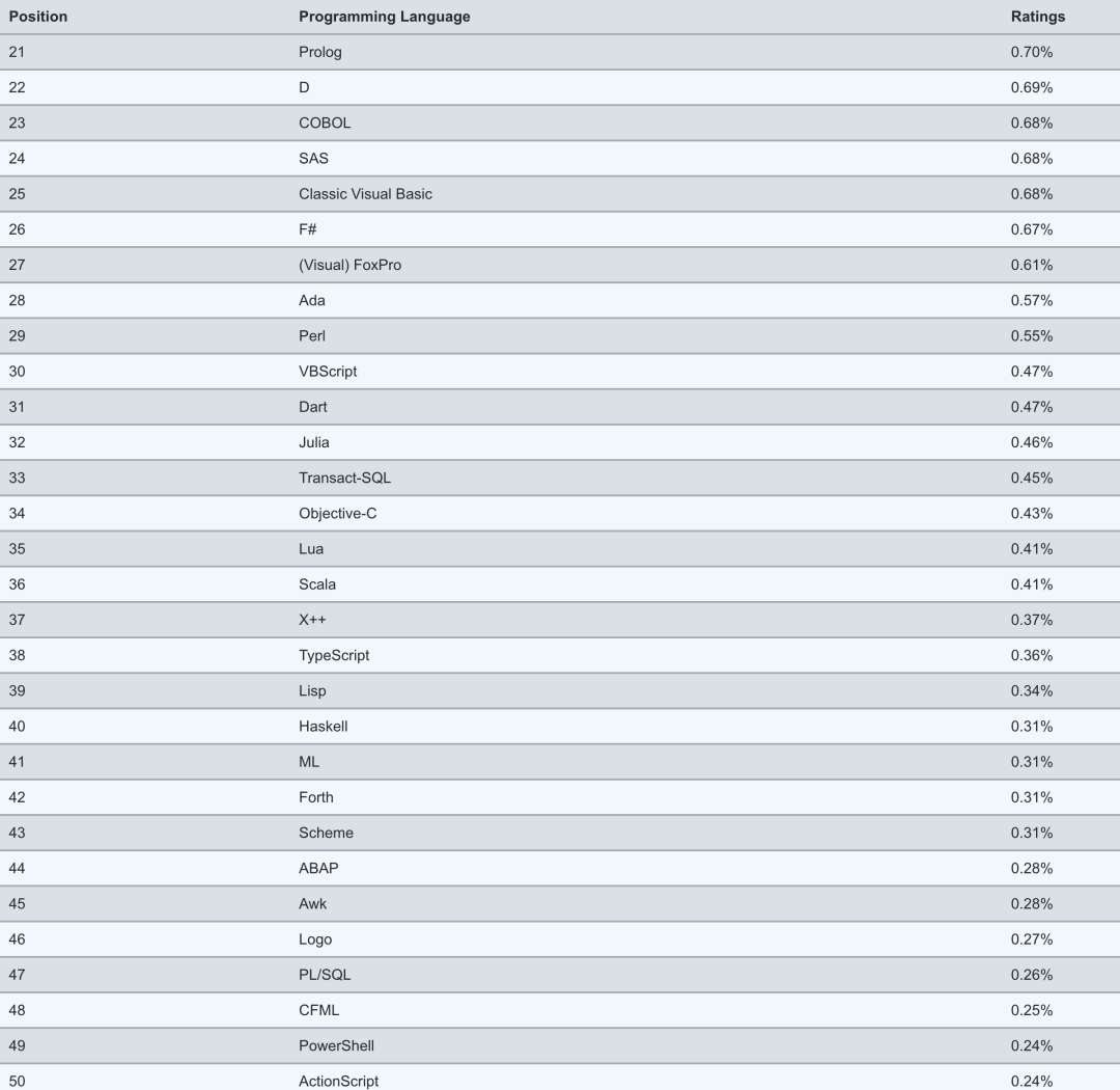 以下为 Top 21-50 的编程语言榜单: