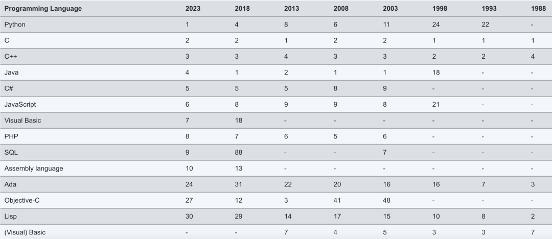2023 年以来,Python 长期稳居第一,也正如 IEEE Spectrum 此前在发布年度编程语言榜单时评价的: