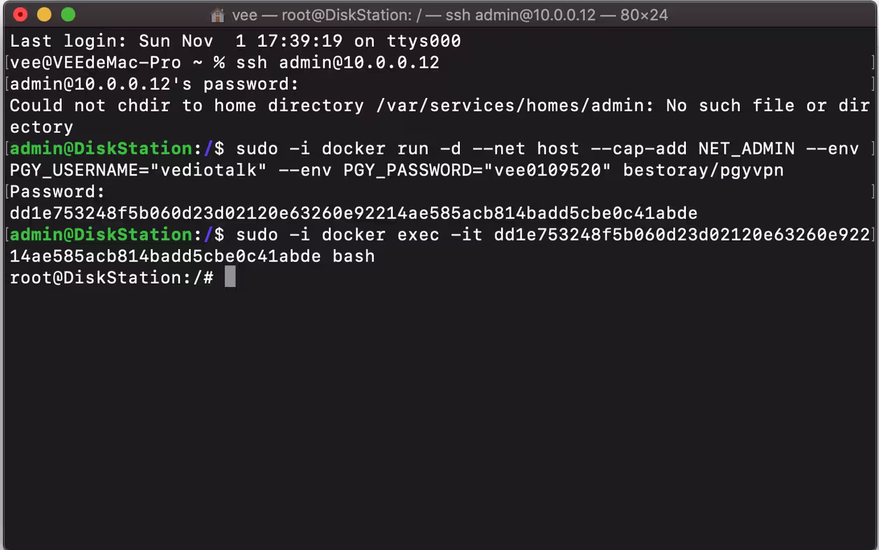 ![]() 3、打开群晖的SSH功能 ![]() lsmod |grep tun #查询是否有驱动 ![]() sudo -i insmod /lib/modules/tun.ko #安装网卡驱动 ![]() 5、创建并进入蒲公英的docker sudo -i docker run -d --net host --cap-add NET_ADMIN --env PGY_USERNAME="xxx" --env PGY_PASSWORD="xxx" bestoray/pgyvpn # xxx的部分替换为蒲公英账号密码 ![]() sudo -i docker exec -it 上面获取的代码 bash ![]() 6、回到蒲公英的后台,即可看到已经绑定成功 ![]() 该文章在 2023/12/28 10:24:23 编辑过 |