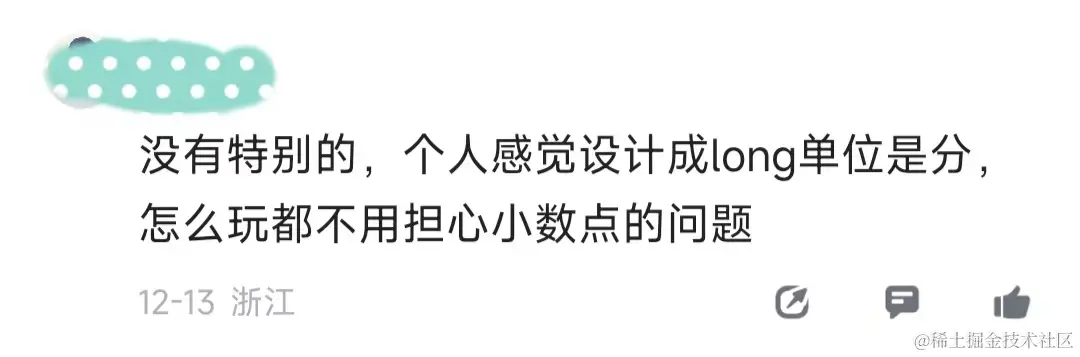 解读:单位到分,没有小数点,也就没有小数精度的问题。而且Long取值范围也足够了。