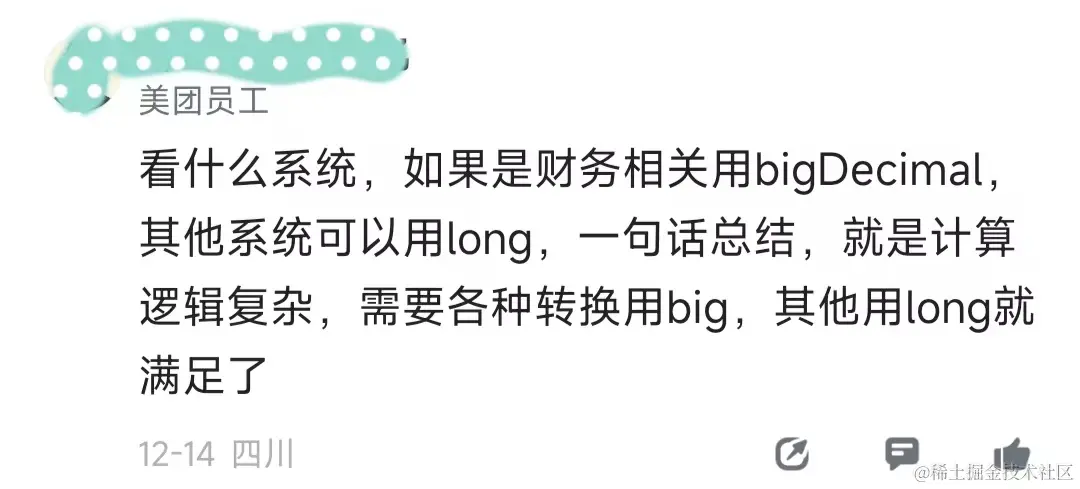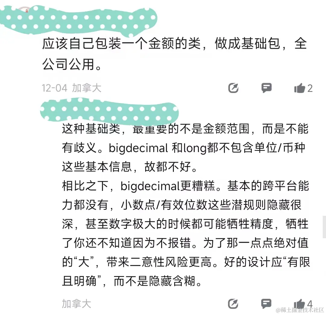 具体问题大概是这样的:关于金额的数据类型,组长认为使用BigDecimal比较稳妥,总监认为使用Long才不会出问题,然后开发认为Long用起来比较爽。