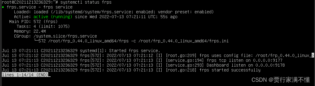 systemctl status frps    #重启服务器后执行此命令查看frp运行状态
