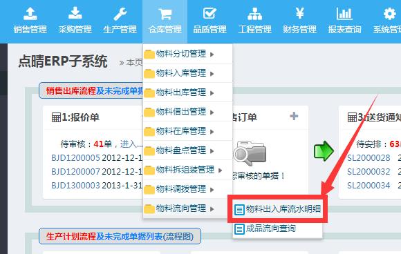![]() ![]() 处理方法如下: 1、进入ERP系统-》仓库管理-》物料流向管理-》物料出入库流水明细: “物料大类”选择全部,或者实际的大类,“物料编码”中输入完整编码,取消“模糊”勾选,清空“出/入库时间”,然后点击“查询”: 然后根据此物料的所有出入库流水信息,分析是否漏操作了哪个步骤,然后补上相应的单据操作。 按照以上操作补充上遗漏的单据后,然后再检查库存是否准确,如果还是不准,也找不到具体的原因,那么就需要对此物料进行盘点了,通过盘点再修正此物料的库存,并对此物料的盘盈或盘亏进行财务上的账务处理。盘点操作参见教程: