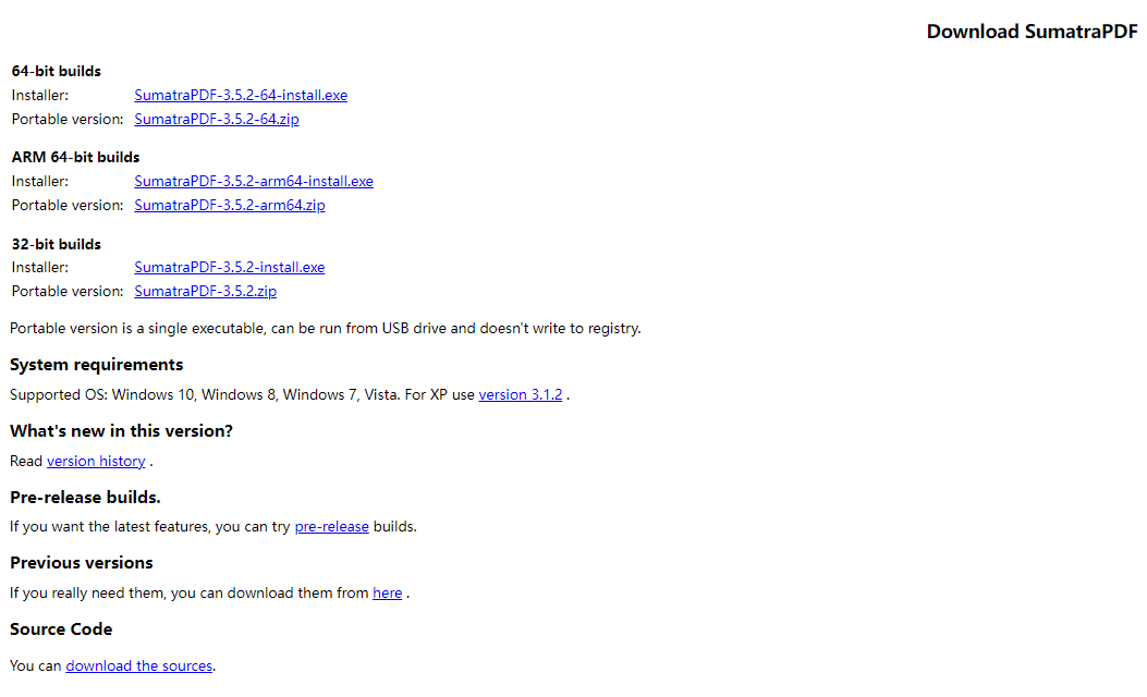 官网链接如下: https://www.sumatrapdfreader.org/free-pdf-reader 官网给我们提供了多种下载方式,可以下载安装版本,也可以下载便携版本,同时还提供源码的下载,官网的链接打开速度可能比较慢,文末小编也给大家提供了安装包,大家可以根据关键字去获取对应的下载链接即可。