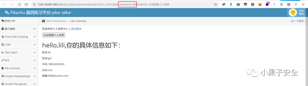 我们发现,lucy的信息是通过username参数以get请求方式提交的,我们这时候就可以修改username参数,修改成lili试试查看其信息,修改username参数的内容直接返回了lili的个人信息