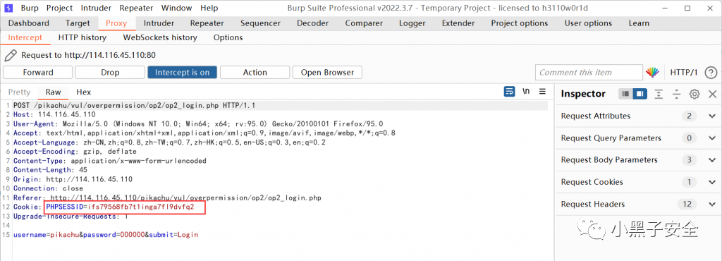 退出登录,使用普通用户登录,并使用Burp抓包获取cookie值:ifs79568fb7t1inga7fl9dvfq2