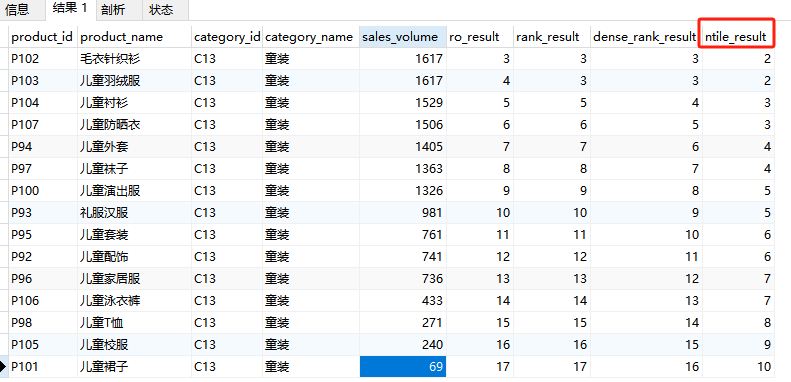 上面的案例显示,童装类别分组下,商品毛衣针织衫和儿童羽绒服销量都是1617,开窗函数row_number的排序结果是顺延,rank的排序结果是相同值并列、后续排序序号不连续,dense_rank的排序结果是相同值并列、后续排序序号连续。 开窗函数NTILE(n) OVER(PARTITION BY 分组列 ORDER BY 排序列)用于将一个结果集分割成指定数量的桶(buckets),并分配一个桶号给每个值。它通常用于在分组数据中将数据等分为多个组。 在上面的案例中,我们对商品分类分组数据集分割成10个桶,桶号从1开始。以童装类别为例,童装类别共17行数据,17不能被10整除,数据集无法均分成10个桶,所以结果集中前面7个桶包含2行数据,后面3个桶包含1行数据。