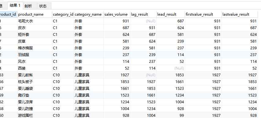 3.2 案例说明 问题:请将数据集按照商品二级类别(category_id)字段进行分组、并利用其他常见窗口函数对sales_volume字段进行处理(主要是为了理解上述函数的作用效果)。 SQL: SELECT a.product_id ,b.product_name ,a.category_id ,c.category_name ,a.sales_volume ,LAG(a.sales_volume,1) OVER(PARTITION BY a.category_id ORDER BY a.sales_volume DESC) AS lag_result ,LEAD(a.sales_volume,1) OVER(PARTITION BY a.category_id ORDER BY a.sales_volume DESC) AS lead_result ,FIRST_VALUE(a.sales_volume) OVER(PARTITION BY a.category_id ORDER BY a.sales_volume DESC) AS firstvalue_result ,LAST_VALUE(a.sales_volume) OVER(PARTITION BY a.category_id ORDER BY a.sales_volume DESC) AS lastvalue_result FROM(SELECT *FROM data_learning.product_order)aLEFT JOIN(SELECT *FROM data_learning.product)bon a.product_id = b.product_idLEFT JOIN(SELECT *FROM data_learning.product_category)con a.category_id = c.category_id; 结果如下(部分截图):