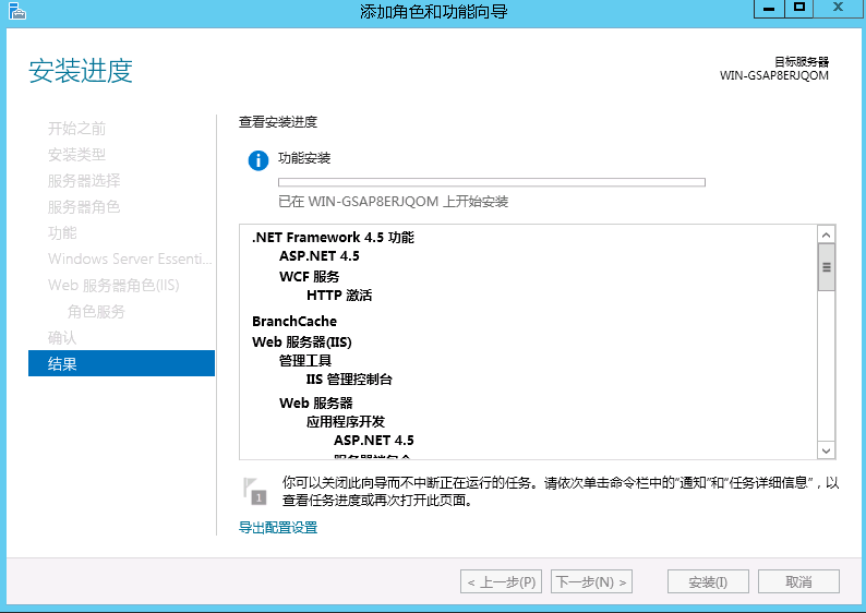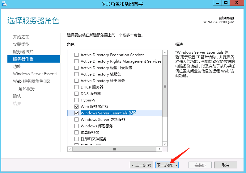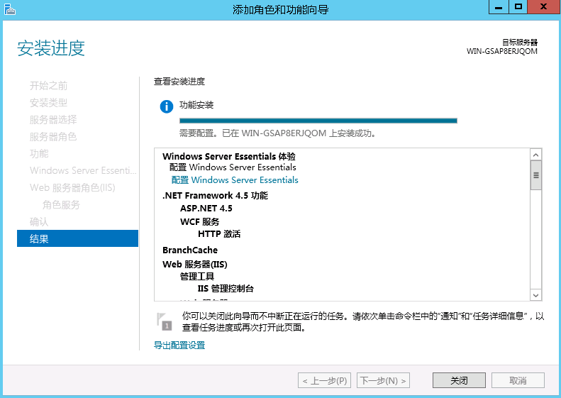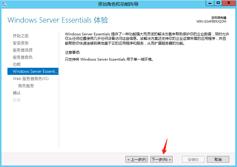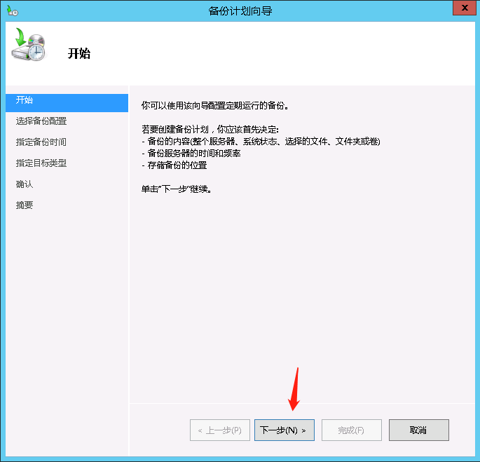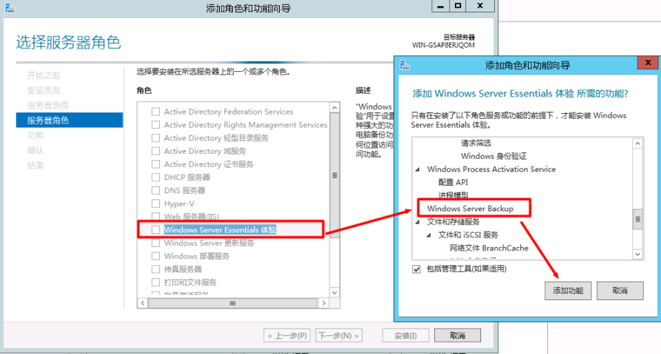打开服务器桌面左下角开始菜单->服务器管理器->添加角色和功能->下一步->基于角色或基于功能的安装->下一步,选择“Windows server essentials体验”,在“Windows server essentials体验”弹出页面选择“windows server backup”添加功能,接着一直默认下一步直到开始安装,安装完成后即可关闭该页面。