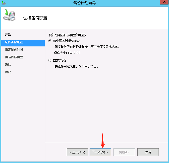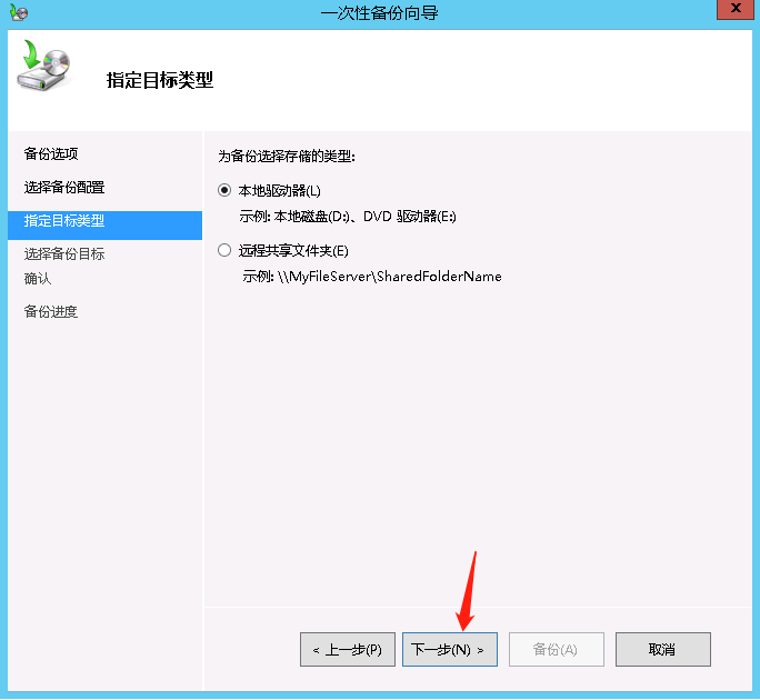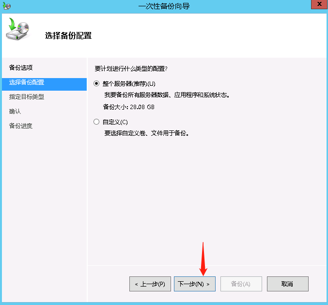 打开服务器桌面左下角开始菜单->管理工具->Windows server backup->本地备份->一次性备份->其它选项->整个服务器->本地驱动器。