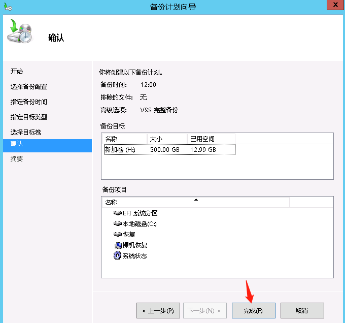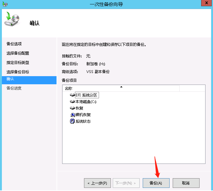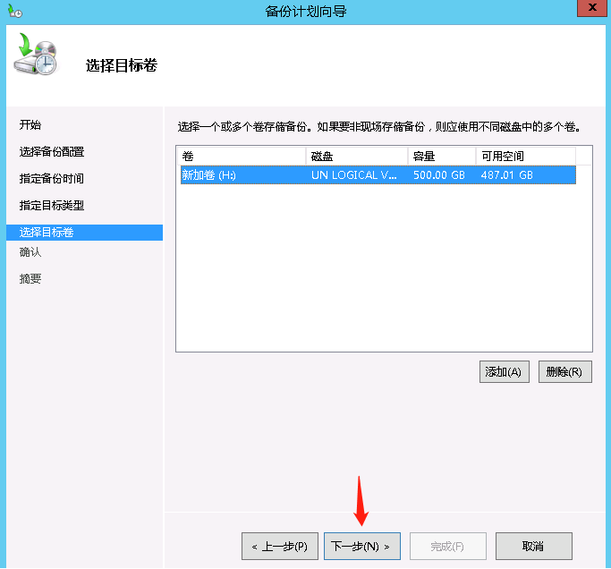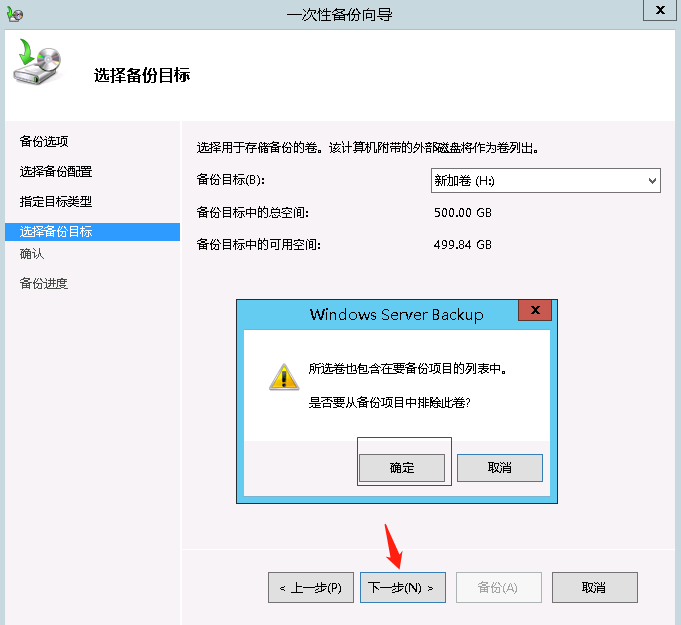 选择要将备份存放的磁盘,此处我们为服务器备份单独建立了一块H盘,备份目标为H盘后下一步,此时会提示我们将要备份的项目中包含H盘,是否要将H盘从备份计划中排除,意思就是备份的时候不用再将H盘备份进来,选择确定。