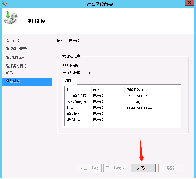 点击备份后开始备份,备份完毕后点击关闭,此时我们可以在本地备份页面看到创建成功的备份。