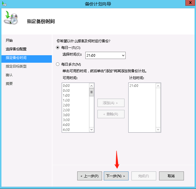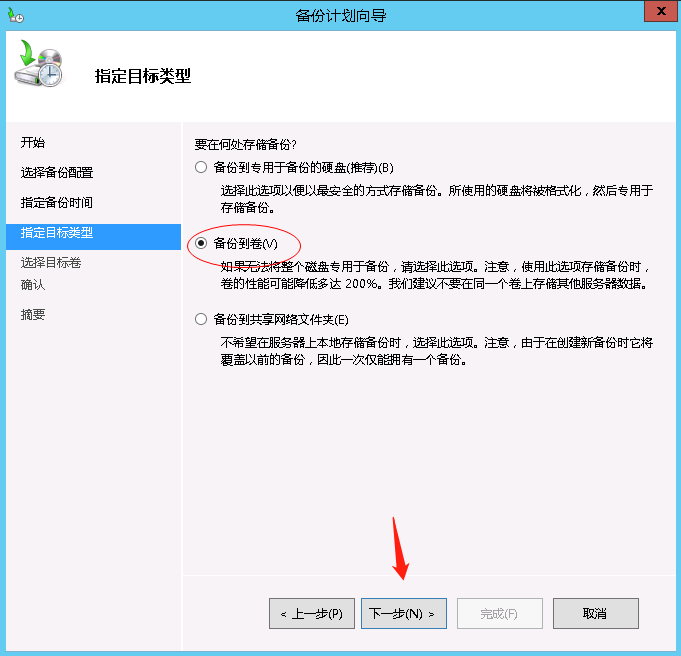 在本地备份界面打开备份计划->下一步->整个服务器,然后选择备份时间,可以选择每日一次或者每日多次备份下一步选择备份数据存储位置,由于没有设置单独的备份磁盘,也没有设置网络路径,因此将备份数据存放到服务器逻辑卷中,然后添加逻辑卷H盘为存放备份数据的位置,点击下一步并完成。