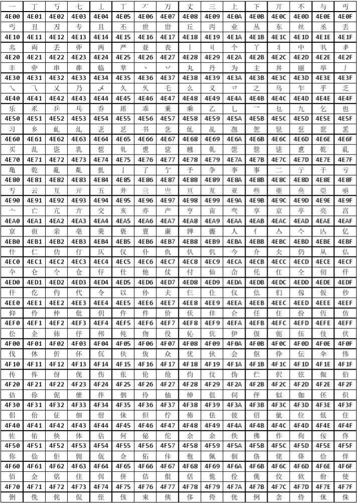 以下为Unicode编码清单,具体字符的编码表请下载Unicode编码表
