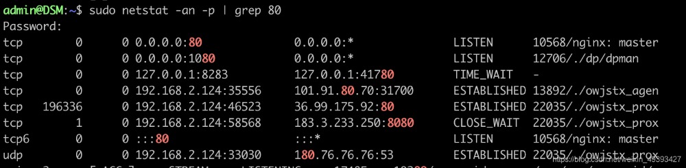 然后用以上命令看一下是什么进程,注意此处必须要用sudo,不然看不到进程名字和pid,可以看到是进程名owjstx_prox,类似还有相同进程前缀的owjstx_agen。谷歌了一下发现是玩物下载的进程,当场就把玩物停用了,一直占带宽写磁盘真的太过分了。。。