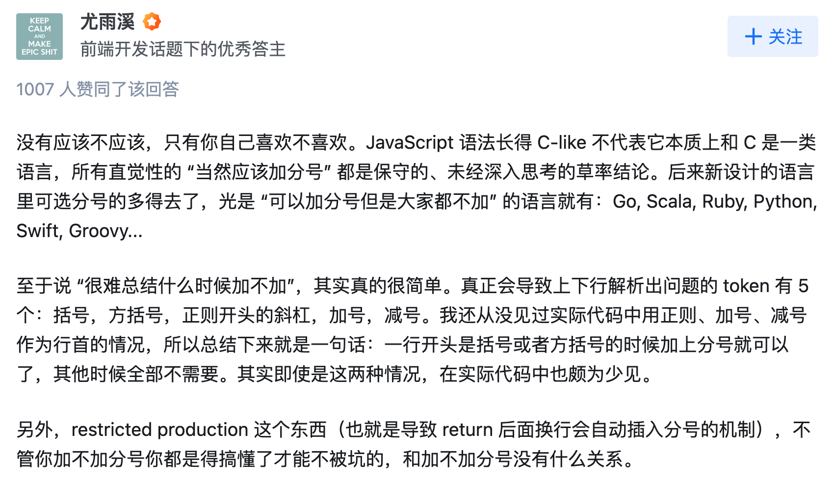 JavaScript 提供了 automatic semicolon insertion (ASI)自动插入分号规则,在不加分号的情况下,会自动补充分号来分隔不同语句。 导致在继左大括号换行、tab 和 space 圣战后,前端又出现了一场战争。 并且随着那个男人加入这场讨论之后,关于是否应该加分号的讨论更是激烈了。