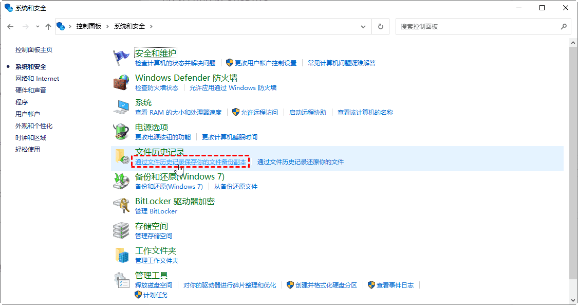 • 以上两个步骤可以替换为以下步骤:单击桌面上的Windows 10“开始”菜单,然后选择“控制面板”。在“系统和安全性”部分,点击“使用文件历史记录保存文件的备份副本”。