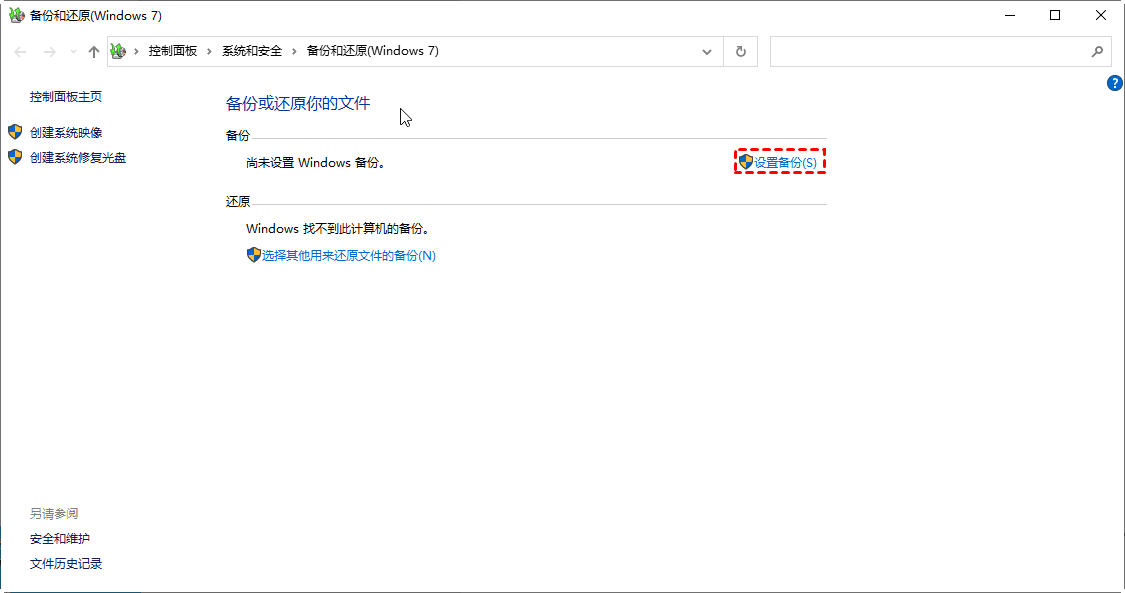 2. 如果你从未使用过Windows备份和还原,请选择设置备份,然后按照向导将Windows 10的完整备份复制到外部硬盘驱动器,DVD或网络共享位置。
