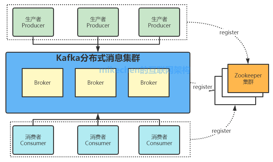 消息通过一个或多个Kafka集群的代理(Broker)进行传输和存储,如下图所示:
