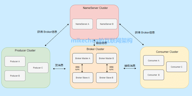 RocketMQ架构:主要由NameServer、Broker、Producer以及Consumer四部分构成。