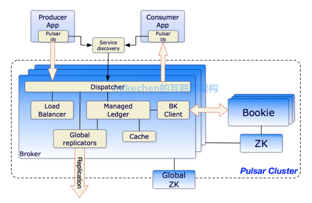 Pulsar被看作是云原生时代实时消息流传输、存储和计算最佳解决方案,其整体架构图如下所示: