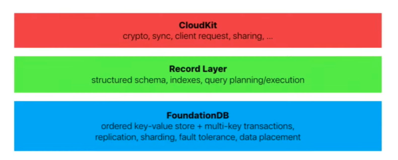 • CloudKit 是最上层,为应用开发人员提供功能和 API。CloudKit 并不是唯一构建在记录层之上的东西,顶部还有其他内部构建的层,用于需要结构化存储的东西,如 JSON 文档存储。